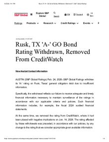 RUSK, Texas — Feb. 24, 2026 — S&P Global Ratings has withdrawn its “A-” credit rating on the City of Rusk’s general obligation debt, citing a lack of sufficient and timely financial information needed to continue monitoring the city’s financial condition.In a public notice issued from Austin, the rating agency stated that the withdrawal was due to its failure to receive key financial documents, including the City’s fiscal year 2024 audited financial statements. Credit rating agencies rely on annual audits and updated financial reports to assess a municipality’s ability to repay borrowed funds and maintain transparency for investors.